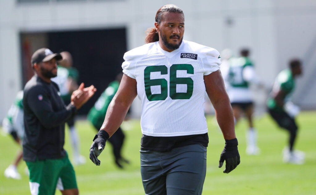 New York Jets offensive guard Teton Saltes (66) during practice at the Jets training camp on Monday, August 2, 2021 in Florham Park, N.J.